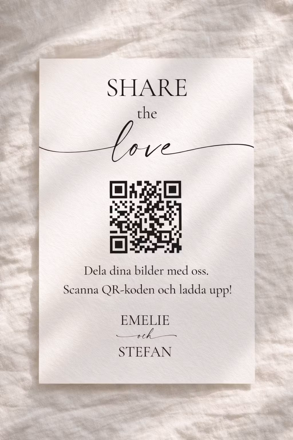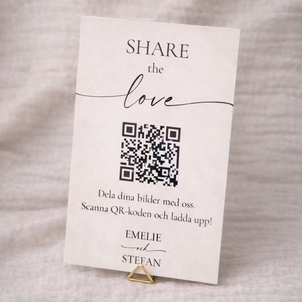 En elegant pappersskylt, tryckt på exklusivt, lätt strukturerat papper och placerad i en minimalistisk hållare i guldfärgad metall. Skylten uppmanar gästerna att dela sina bilder från dagen via QR-kod – ett enkelt och vackert sätt att samla minnen från bröllopet. Perfekt för välkomstbord, festlokal eller presentbord.