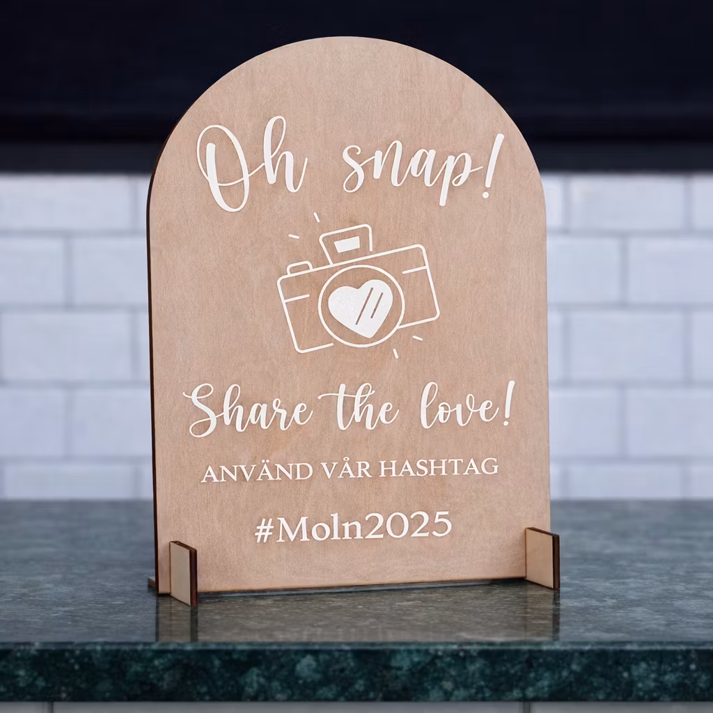 Gör ert bröllop extra minnesvärt med en vacker, handgjord skylt i betsat trä som uppmanar gästerna att dela sina bilder från dagen! Skylten fungerar som ett charmigt inslag vid gästboken, fotohörnan eller vid entrén, och påminner era nära och kära om att använda er unika bröllopshashtag när de lägger upp bilder.