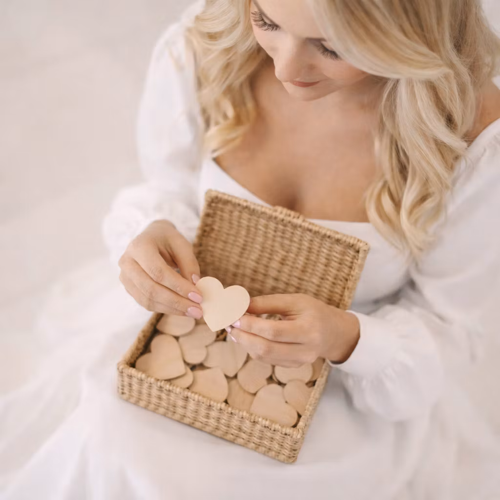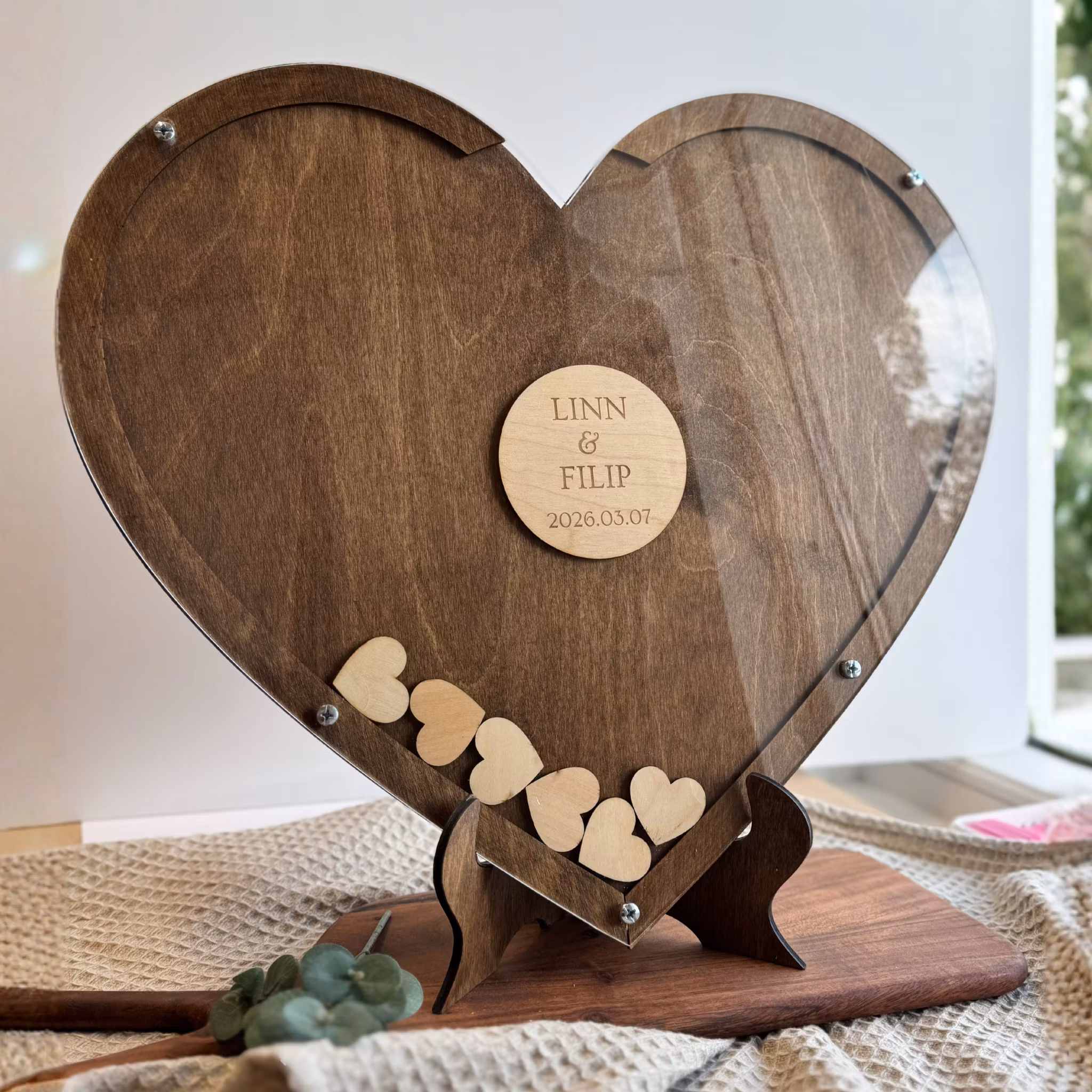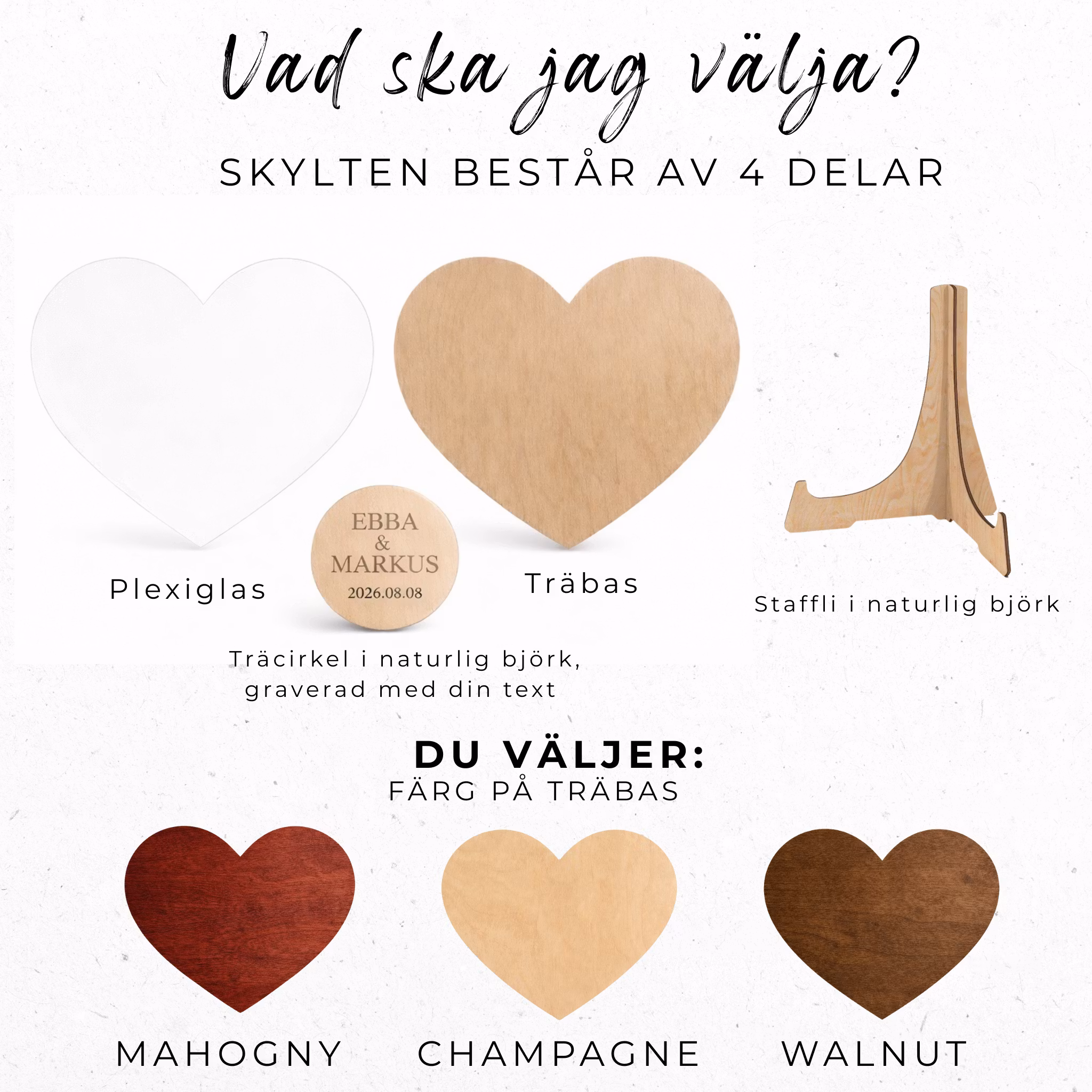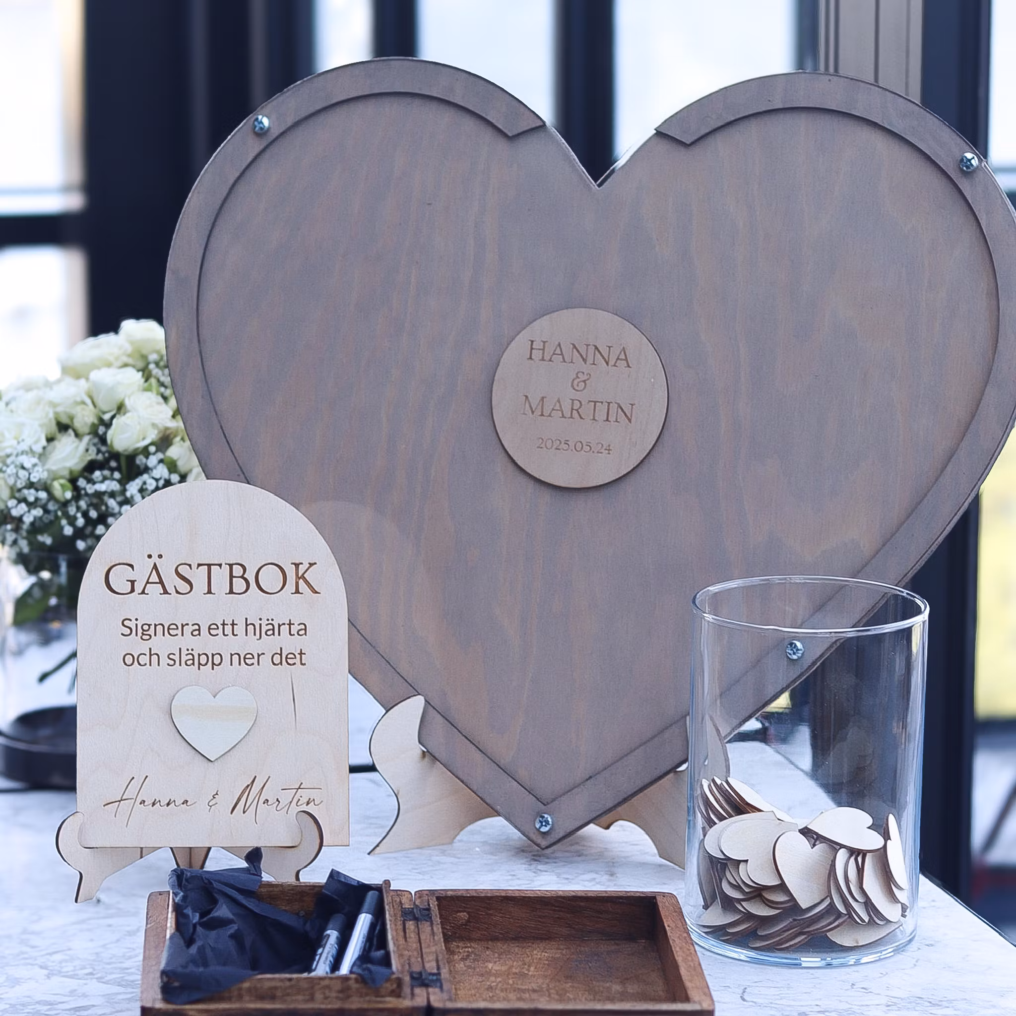 🤍 Tillgängliga för 30 till 90 gäster – varje gästbok anpassas i storlek efter antalet trähjärtan som väljs.
