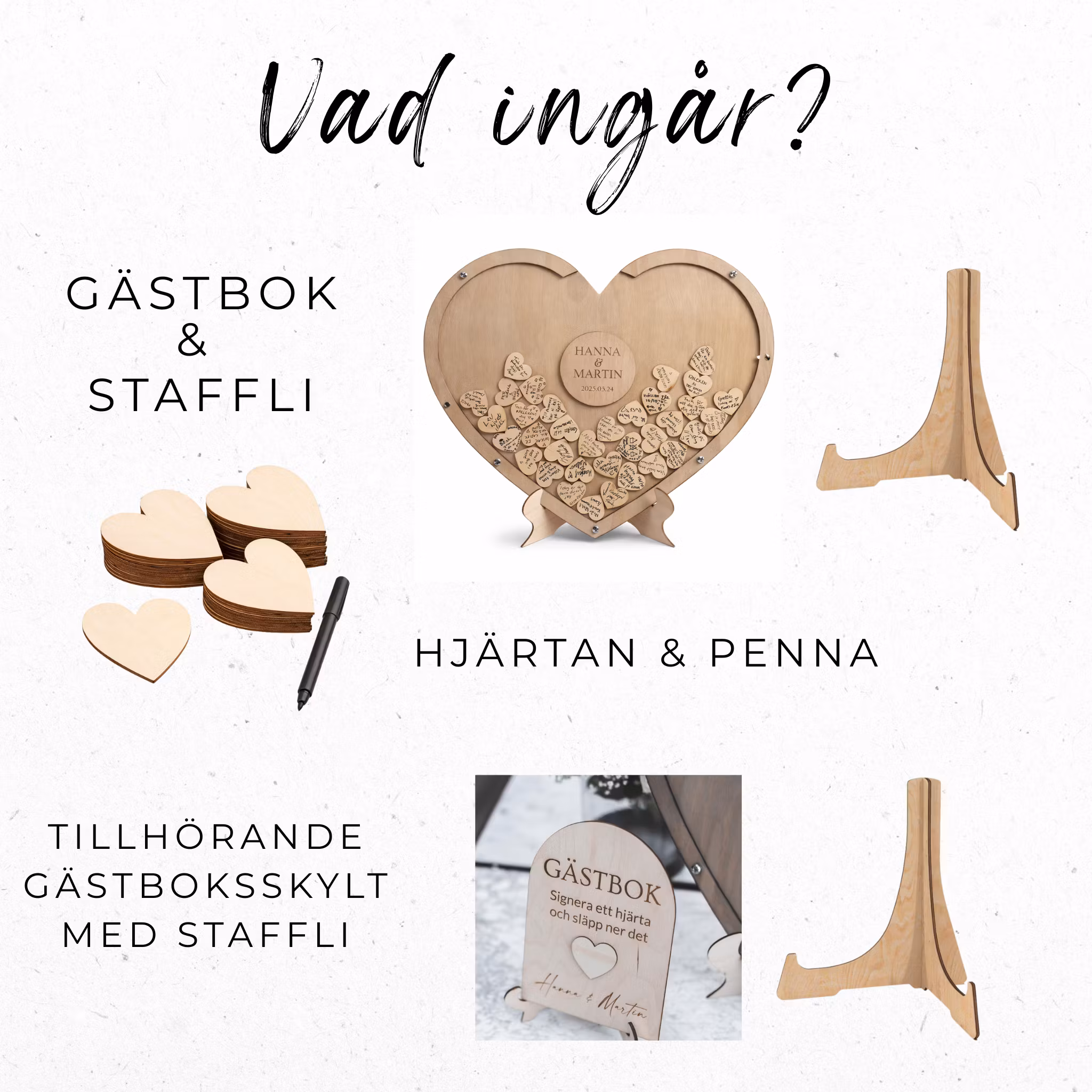 🤍 Gästboken levereras med en penna samt ett stativ så att den kan stå stadigt och gästerna enkelt kan lägga i sina hjärtan efter att ha skrivit.