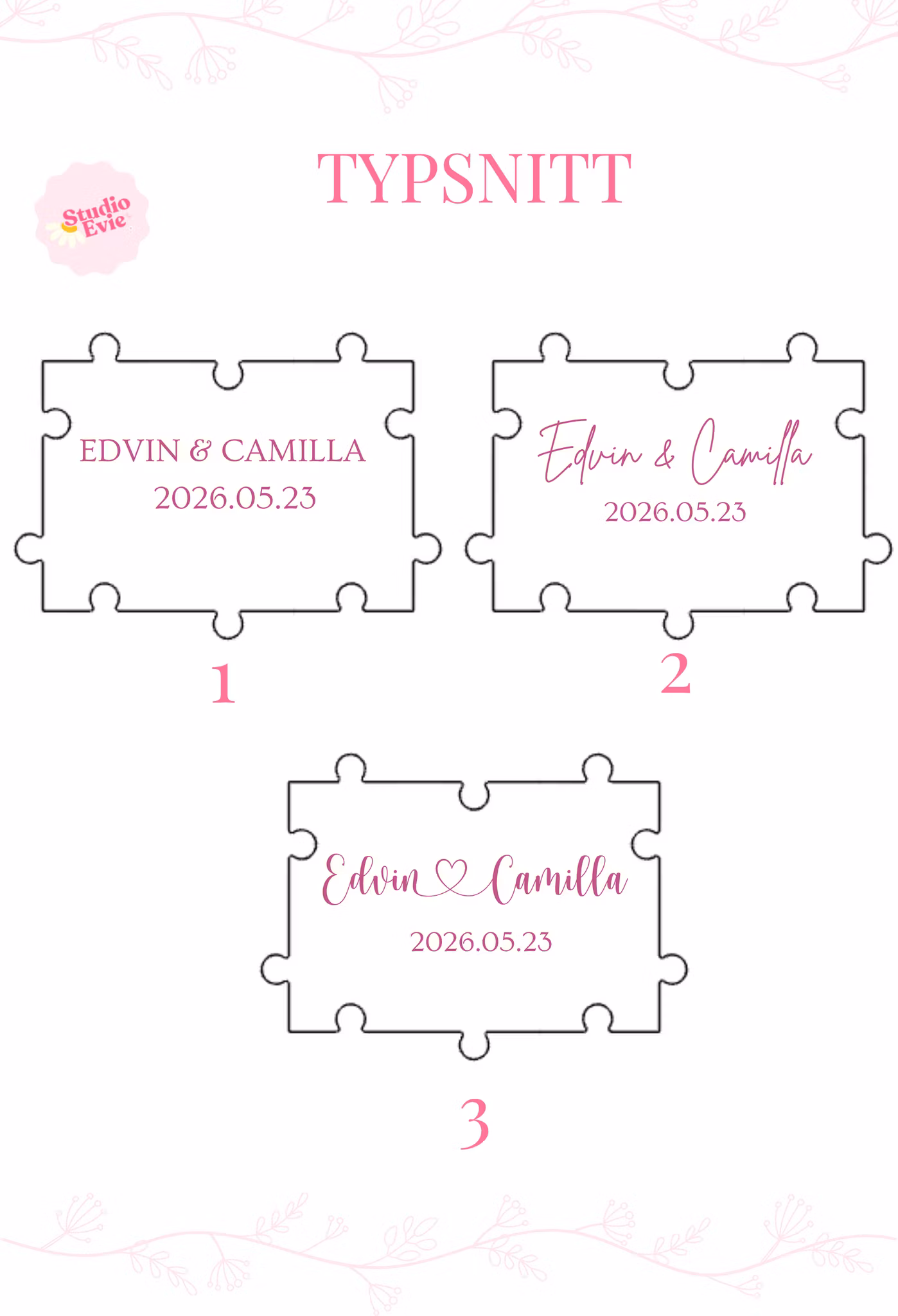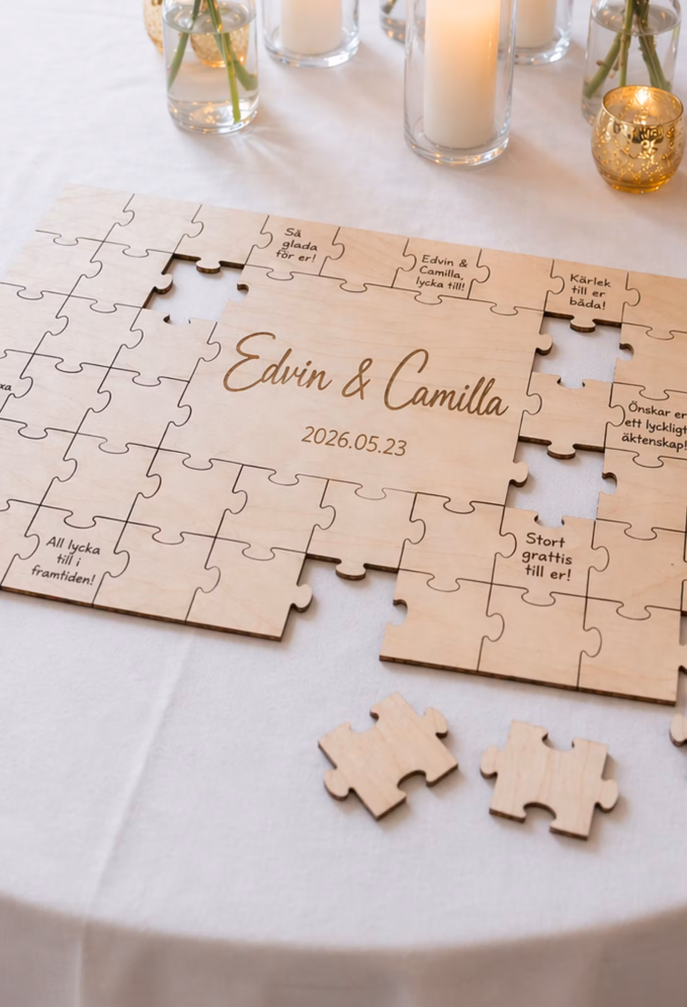 I mitten av pusslet graveras era namn och bröllopsdatum med laser – en personlig detalj som gör det hela ännu mer speciellt. Efter bröllopet kan ni rama in pusslet eller plocka fram det igen och återuppleva alla fina ord bit för bit.