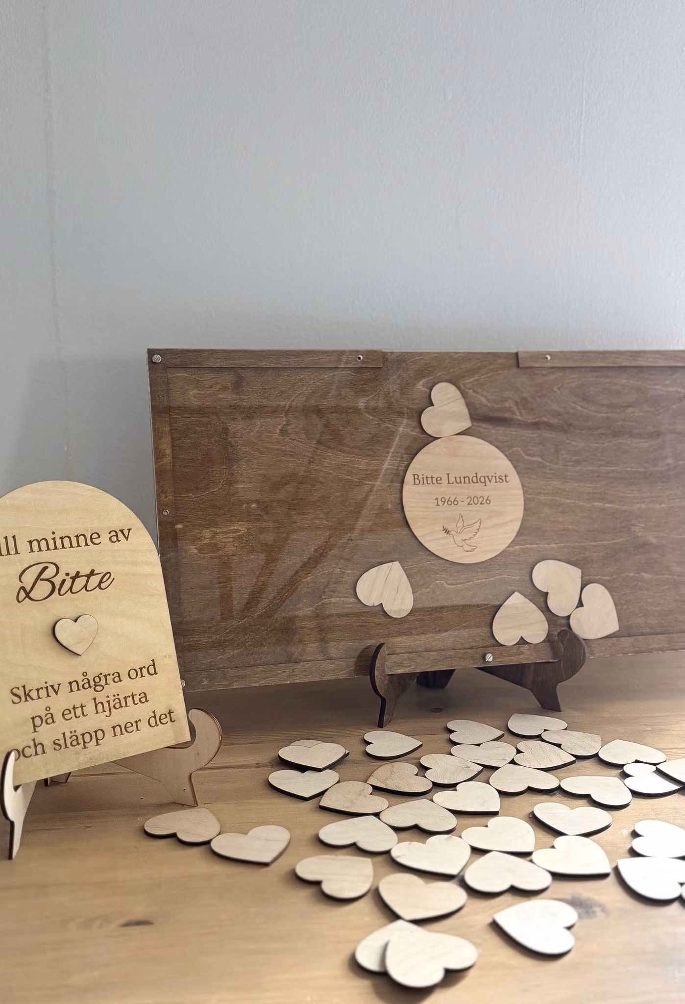 En vacker och minnesfull gästbok i form av en dropbox, där gäster kan skriva personliga hälsningar på små hjärtan och lägga dem i tavlan. Tillverkad i trä och akryl med en stilren och varm design som passar fint vid minnesstunder.