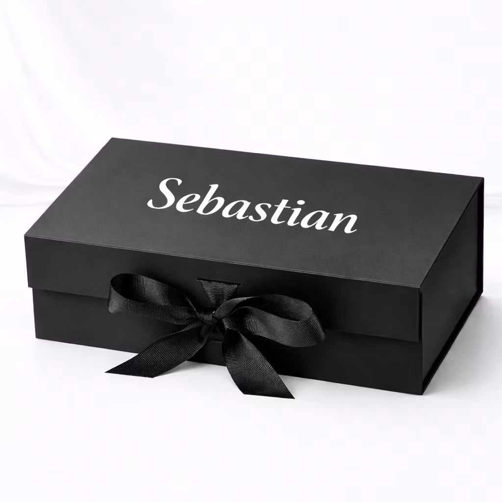 Elegant svart presentbox med stilrent tryck i vitt, guld eller roseguld, anpassad med valfri text. Försluts med magnet och ett matchande sidenband.