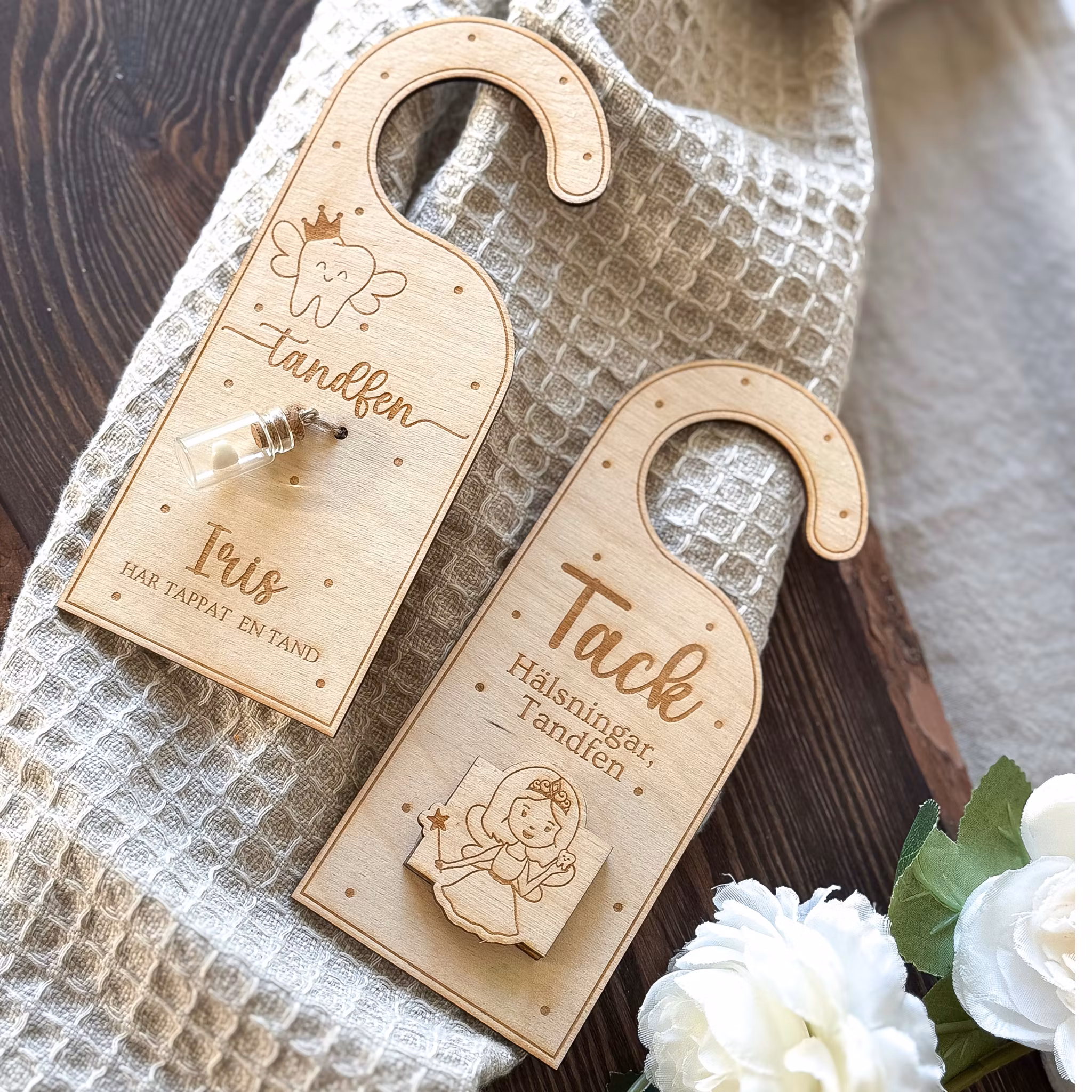 Gör tandtappning till en magisk stund med vår handgjorda dörrhängare i trä – perfekt för barnets första möte med tandfén! Denna charmiga hängare hängs enkelt på barnets dörrhandtag och har en liten glasflaska där den tappade tanden försiktigt placeras. På natten byts hängaren ut av tandfén mot en ny – med en överraskning i form av en 10-krona eller en sedel.